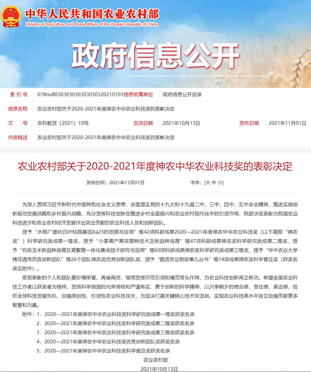 11月1日,农业农村部官网发布了《关于2020-2021年度神农中华农业科技奖的表彰决定》(农科教发〔2021〕10号),对在2020-2021年度为我国农业科技进步和农业农村经济发展作出突出贡献的农业科技人员和创新团队进行表彰。由PA视讯主持,联合江苏省农业技术推广总站、扬州大学共同完成的“稻麦两熟亩产1200公斤绿色高效关键技术创新与应用”项目获得科学研究类成果三等奖。