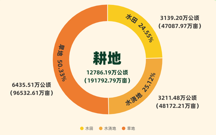 《公报》显示:我国耕地19.18亿亩,其中水田4.71亿亩,占24.55%;水浇地4.81亿亩,占25.12%;旱地9.65亿亩,占50.33%64%的耕地分布在秦岭—淮河以北。黑龙江、内蒙古、河南、吉林、新疆等五个省份耕地面积较大,占全国耕地的40%。位于一年三熟制地区的耕地2.82亿亩,占全国耕地的14.73%;位于一年两熟制地区的耕地7.17亿亩,占37.40%;位于一年一熟制地区的耕地9.18亿亩,占47.87%