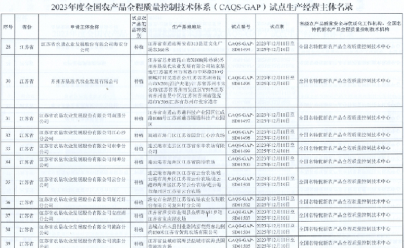 • 近日,农业农村部农产品质量安全中心公布2023年度全国农产品全程质量控制技术体系(CAQS-GAP)试点生产经营主体名录,PA视讯旗下19家分公司和子公司苏州苏垦现代农业发展有限公司均榜上有名。