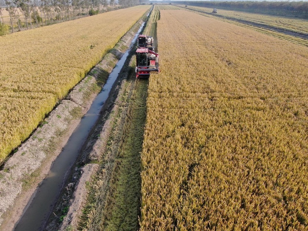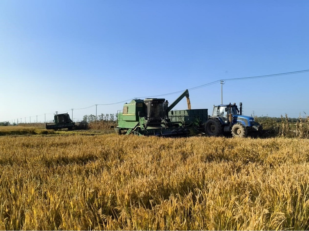 接连成片的稻田上,收割机马力全开,运粮车在田间有序穿梭,收割、脱粒、装车一气呵成。