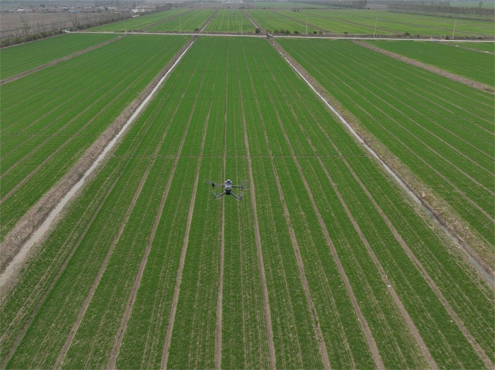 在播种完小麦的田间,无人机有序飞行在半空,像田间卫士一样,记录着在田作物状况。播种后,各基层单位主动组织无人机飞手进行随机巡田,及时召开生产检查通报视频会议,以此强化生产管理,为小麦高产打下坚实基础。