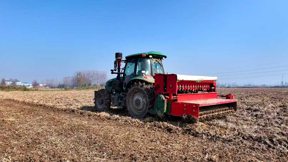 精细化管理是今年秋播工作的又一亮点。各外拓基地根据当地实际情况,制定了详细的秋播技术方案和田间管理预案。基地办全体人员分区包干,驻点跟踪服务,对整地质量、播种深度、密度和施肥量等进行专项督查指导,做到“一区一策”,实现精准化管理。同时,加强土壤墒情监测,密切关注天气变化,及时做好抗旱防涝准备,确保秋播小麦在最佳环境下生长。此外,充分发挥现代农业机械化优势,外联大批先进、智能的农业机械参与秋播作业。根据今年土壤墒情,选择小履带拖拉机进行开沟作业,安装了北斗导航系统的智能化播种机实现直线播种、播深一致,不仅大幅提升了作业效率和质量,也为后续的田间管理和机械化收获创造了有利条件。