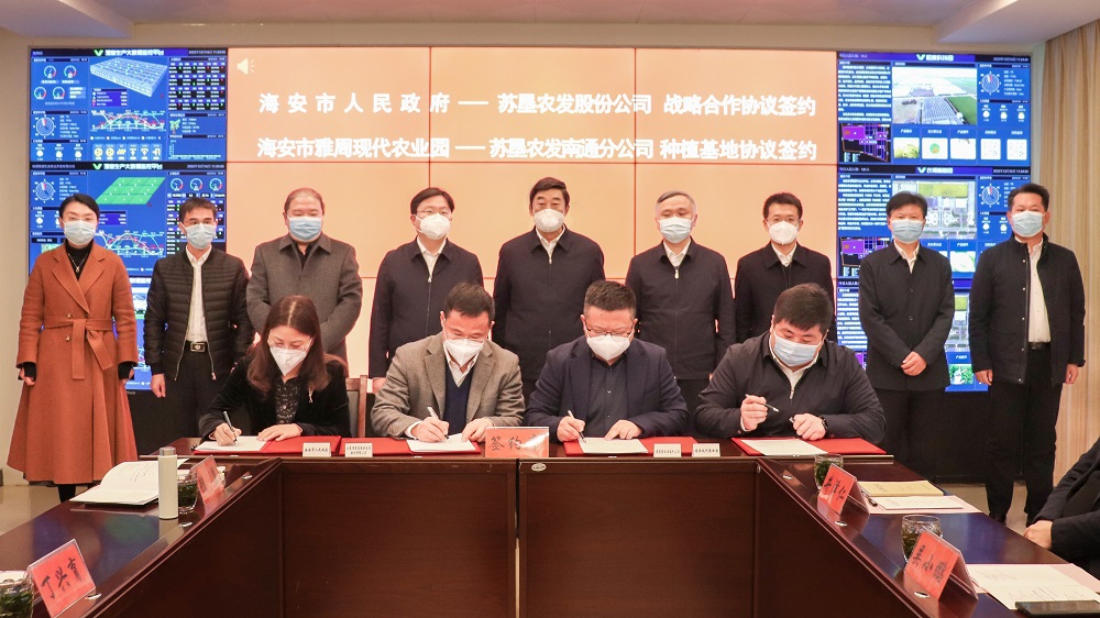 12月16日上午,PA视讯股份公司与海安市人民政府战略合作协议签署仪式在海安雅周现代农业园举行。集团公司总经理、PA视讯股份公司董事长胡兆辉,海安市市长谭真出席仪式并致辞,PA视讯股份公司总裁朱亚东与海安市副市长周平分别代表双方签署战略合作协议。 胡兆辉对海安市长期以来给予江苏农垦的关心支持表示感谢,向协议的签署表示祝贺,并介绍了集团公司历史沿革和改革发展取得的显著成效。胡兆辉指出,双方长期保持着密切合作,共同肩负保障国家粮食安全的政治责任,在建设高标准农田、创建国家现代农业产业园、打造全省一流的粮食生产示范基地等方面目标吻合、方向一致。今年以来,双方继续深化合作,积极推动建立PA视讯南通分公司海安基地,着力打造辐射带动周边的绿色稻米产业基地、粮油轮作示范基地、现代农业示范基地。胡兆辉表示,双方要紧紧围绕党的二十大精神,沿着习近平总书记指引的方向深耕农村、深化合作,实现资源共享、优势互补,共扩种植规模、共建种繁基地、共创示范效应,携手打造省属国企和地方合作的标杆典范。 谭真代表海安市委市政府对胡兆辉一行的到来表示欢迎,对江苏农垦长期以来关心支持海安“三农”事业发展表示感谢